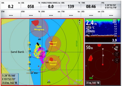 Our detour north paid dividends throughout the night as we entered the Australian East Coast Current, following its curve north of Fraser Island. The current, fair wind and benign sea state allowed us to keep the pace up above 7 knots until the wind started abating in the early hours. At 5AM we had to douse all sail as they were just flapping and we started motoring for home. We had 1.5 knots of current going our way, as we hitched a ride on the flood tide into Hervey Bay.